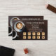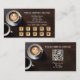 Lojalitetsaffärskort med en cappuccino och espresso på en mörk trämiljö. De guldbelagda och rose gold-stiliserade stämpelnummerbakgrunderna är i en separat fil och du kan ta bort dem om du föredrar anpassade fält. Hjärtbilden på framsidan är också valfri. På baksidan finns en lättanvänd QR-kodmall.