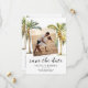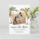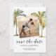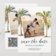 Sparadatumkort för sommarens destination! Tillverkade med en enkel vit bakgrund, 2 bilder av bruden och brudgummen, tropiska palmträd i akvarell, en QR-kod (ersätt denna med din egen) och en lättanvänd elegant mall.