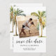 Sparadatumkort för sommarens destination! Tillverkade med en enkel vit bakgrund, 2 bilder av bruden och brudgummen, tropiska palmträd i akvarell, en QR-kod (ersätt den med din egen) och en lättanvänd elegant mall.