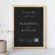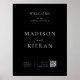 Detta välkomnande poster i elegant bröllop har en minimalistisk utformning med rent linjer och en modern estetik. Texten är centrerad och ramad med ett tunt svart gräns, med ett polerat och sofistikerat utseende. Poster hälsar gästerna varmt välkomna till ceremonin i bröllop och lyfter fram parets namn i djärvt, snyggt typsnitt, och skapar en slående kontaktpunkt. I grund ingår bröllop datum och plats i ett litet, förfinat teckensnitt. Dessutom finns det en QR-kod på högerna grund, där gästerna uppmanas att söka och visa bröllopsprogrammet digitalt och lägga till en contemporary till den klassiska designen. Den övergripande layouten är elegant, enkel och effektiv perfekt för ett modernt bröllop.