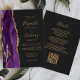 Det lämnat kant har en lila vattenfärgsagat gräns som trimmas med guld faux glitter. Anpassadet kombinerar handskrift, rityta och kursivt typsnitt med guld-färgad på en svart bakgrund. Den omvända sidan ger plats för bröllop-information på en solid skifferbakgrund, tillsammans med en QR-kodgäst som kan söka på din webbplats och OSA, vilket sparar kostnaderna för utskrift och utskick av separat OSA kort.