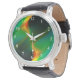 En blå, grönt- och orange fyrkantsbild med stjärnor i bakgrunden.