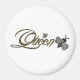 Drottning Bee-kylskåp Magnet- A dekorativ guld-textmagnet med kursiv ord: drottning. Två små bin skapat med silver och guld glitter förskönar texten. Bakgrunden är helt vit.