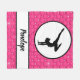 Den här designen är livfull i färg, personlig med ditt barns namn, har en kvinnlig silhuett som gör ett handställ som är populärt i gymnastik, dans, cheer och till och med yoga. Bakgrunden till mönster ser ut som en puffig filt med noshörningar överallt.