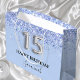 Elegant, klassisk, glamorös och giftig för en Quinceañera, 15:e födelsedagsfesten. Ett trendig baby blue, ljusblå bakgrund. Dekorerad med faux glitter damm. Anpassa och lägg till ett namn. Med texten: Grattis på födelsedagen. Namn är skrivet med ett modernt handskript i stil. Nummer 15 skrivs med ett stil-teckensnitt med ballong.