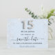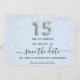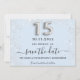 Ett girigt och trendig Spara datum för en Quinceañera, 15:e födelsedagsfesten. Blåblå bakgrund som dekoreras med faux glitter stoft. Anpassa och lägg till datum och namn/ålder. Texten: Spara datumet skrivs med ett stort trendig-handskript i stil. Nummer 15 med ett stil-teckensnitt med ballong.