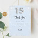 Ett feminin- och elegant-födelsedagskalas tack för ett Quinceañera party. En ljusblå, baby blue bakgrund färg, med faux silver glitter, gnistor. På framsidan finns ett skript med stora bokstäver och texten: Tack. Anpassa och lägga till tackkort och namn