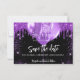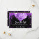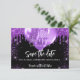 Ett girigt och trendig Spara datum för en Quinceañera, 15:e födelsedagsfesten. En svart bakgrund som dekoreras med lila faux glitter drops, gnistor och ballonger. Anpassa och lägg till datum och namn/ålder. Texten: Spara datumet skrivs med ett stort trendig-handskript i stil.