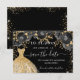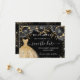 Ett giftigt och trendig Spara datumkortet för en Quinceañera, 15:e födelsedagsfesten. En svart bakgrund dekorerade svart ro, faux guld glitter och en guldklänning. Anpassa och lägg till datum och namn/ålder. Texten: Spara datumet skrivs med ett stort trendig-handskript i stil.