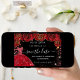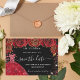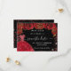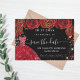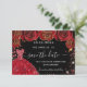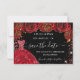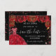 Ett giftigt och trendig Spara datumkortet för en Quinceañera, 15:e födelsedagsfesten. En svart bakgrund dekorerad röd ros, röda faux glitter-gnistor och en röd klänning. Anpassa och lägg till datum och namn/ålder. Texten: Spara datumet skrivs med ett stort trendig-handskript i stil.