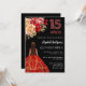 En modern, snyggt och glamorös inbjudan till en Quinceañera, 15:e födelsedagsfesten. En svart bakgrund, en flicka med röd klänning och guld och röd, rosa och gyllene ro, blommigtar. Namn är skrivet med ett modernt handskript i stil. Anpassa och lägg till information om party.