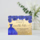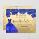 Ett girigt och trendig Spara datum för en Quinceañera, 15:e födelsedagsfesten. En faux guld-bakgrund dekorerade blått ro, gyllene och blå färgad faux glitter-gnistor och en royalets blå klänning. Anpassa och lägg till datum och namn/ålder. Texten: Spara datumet skrivs med ett stort trendig-handskript i stil. 1 lakan = 1 spara datumet som skrivs ut kant till kant.