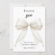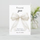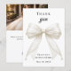 A modern and elegant Quinceañera thank you card. A white background, decorated with a large ivory colored bow with pearls. On the front the text: Thank You, name, and a date.