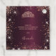 För en elegant Quinceañera, 15:e födelsedag. En burgundisk faux metallisk tittar bakgrund färg. Dekorerad med damm från ro faux glitter och en tiara, krona. Anpassa och lägg till namn, ålder och datum. Quinceañera är skrivet med ett modernt handskript i stil med dekorationer. Tillbaka: lägg till ett tackkort och ditt namn.