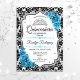 Silver, svart, vit Quinceanera firande inbjudan. Innehåller dämpat mönster, typsnitt, akvblått ro, tiara och konetti. Klassblått utkast med faux glitter silver. Perfekt för en elegant glam firande.