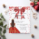 En modern, snyggt och glamorös inbjudan till en Quinceañera, 15:e födelsedagsfesten. En vit bakgrund med konfetti, en röd klänning och en röd båge. Namn är skrivet med ett modernt handskript i stil. Anpassa och lägg till information om party. 1 lakan = 1 inbjudan tryckt kant till kant.