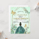 Elegant invitation for a debutante party in shades of green with touches of Gold with an illustration of a dress and butterflies