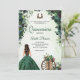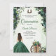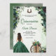 Quinceañera invitation card featuring a girl in a green dress facing away, surrounded by green floral accents, with a rustic wagon. Elegant and celebratory.
