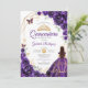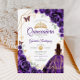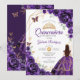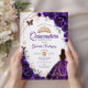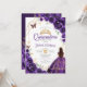 Inbjudan till lila, guld och vita Quinceanera firande. Features, brunette girl in boll gown dress, script font, guld butterflies, water color ro och tiara. Perfekt för en elegant prinsessan stil glam firande. Anpassa med dina egna detaljer. Skrivna Zazzle-inbjudningar eller digital utskrivbar mall för omedelbar nedladdning.