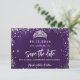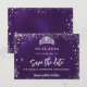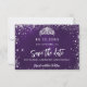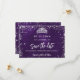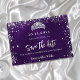 Spara datumkortet för en Quinceañera, 15:e födelsedagsfesten. Ojämnt fördelad lila färgad. Dekorerad med faux silver glitter sparkles och tiara. Texten: Spara datumet skrivs med ett stort trendig-handskript i stil.
