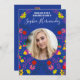 Royal Blue, Photo Quinceanera-inbjudan med mexikanska fiesta party-blommor, för din dotters 15:e födelsedag. Den här blommigten Quinceañera-temat har färgstarka mexikanska konstblommor, elegant och western stil-typografi. På baksidan av kortet finns en blommigt fontän som är gjord av samma fiesta-blommor och din inbjudan. Mallen är konfigurerad så att du kan anpassa kortet med ditt foto och alla dina personuppgifter för ditt mexikanska Fiesta Quinceanera party. Bläddra i butiken för matchning och samordning av objekt.