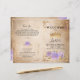 Skapa dina egna vackra, elegant guld och lätta lila quinceanera-program på en vintage gammal papper DIY-mall för parchment i rulla. Det är enkelt att lägga till information om händelser i personligen med det stora utrymme som det vikta lakan tillhandahåller. Raphaela Wilsons unika konst för blommigt av vattenfärg riktar strålkastaren på lavender ro med fingerade metalliska guld-accenter, royal prinsessan krona / tiara, gnistra konetti glitter butterflies och lyxfiligree gräns. Medan chicens typografi i exemplet visar kalligrafiskript och modernt typsnitt, kan du redigera stil. Det är designat att lägga över det beklädda parchment lakan i papper på halva, och det är inte bara ett komplement till en lilak och guld: den rustiska rancheraktionen på ett vackert sätt, utan också en mexikansk söt 16 födelsedagsfester. Ordna om dem för elegant bröllop-program, bland andra speciella evenemang där gången på en tidsinställd vintage krävs. Lägg till information om anpassningsbar, t.ex. namn, plats, datum, massceremoni, serviceordning, det berömda party för kambelaner/dammar, plus ett personlig tack för ditt budskap. Om du föredrar att behålla texten till ett minimum finns det utrymme för ett glamoröst Mis Quince Anos bild / foto. Ditt program för ljussken lila och guld kan hållas som en omhuldad keepy långt efter att firande har passerat. Njut! Kategori: traditionellt upplagt quinceañera-programschema/XV-mallidéer, bröllopsprogram av saga princess med butterfly-konetti och bröllopsprogram för lavender-vattenfärg. Guld och lavender quince Tema färg: dammig lila, lavender, blek lilac, pastellviolett, tan, mjukt brun, gult champagne guld, svart och vit.
