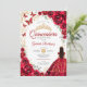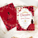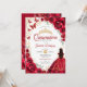 Red, gold and white Quinceanera celebration invitation. Features brunette girl in ball gown dress, script font, gold butterflies, watercolor roses and tiara. Perfect for an elegant princess style glam celebration. Personalize with your own details. Printed Zazzle invitations or instant download digital printable template.