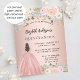 En modern, snyggt och glamorös inbjudan till en Quinceañera, 15:e födelsedagsfesten. En ro guld-bakgrund med blommor av rosa, en flicka med en boll-gryning. Namn är skrivet med ett modernt handskript i stil. Anpassa och lägg till information om party. 1 lakan = 1 inbjudan tryckt kant till kant.