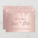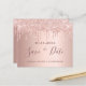 Ett giftigt och trendig Spara datumkortet för en Quinceañera, 15:e födelsedagsfesten. En faux-metallisk tittar i ro guld en bakgrund som dekoreras med faux ro guld glitter drops. Mallar för datum och namn och text. Mörk ro guld färgad brev. Texten: Spara datumet skrivs med ett stort trendig-handskript i stil.
