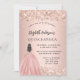 En modern, snyggt och glamorös inbjudan till en Quinceañera, 15:e födelsedagsfesten. En ro guld-bakgrund med faux sparkles, en flicka med en boll-gryna. Namn är skrivet med ett modernt handskript i stil. Anpassa och lägg till information om party.