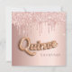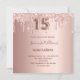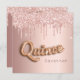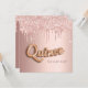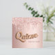 För en lyxig Quinceañera, 15:e födelsedagsfesten. En bakgrund ro guld med ro guld och rosa droppar, färgdropparnas utseende. Texten: Quince skrivs med ett stil-teckensnitt med ballong. Anpassa och lägg till information om namn och party