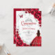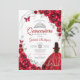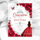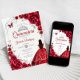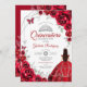 Röd, silver och vit inbjudan till Quinceanera firande. Features, brunette girl in boll gown dress script font, butterflies, water color ro och tiara. Perfekt för en elegant prinsessan stil glam firande. Anpassa med dina egna detaljer. Skrivna Zazzle-inbjudningar eller digital utskrivbar mall för omedelbar nedladdning.