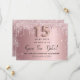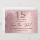 Ett giftigt och trendig Spara datumkortet för en Quinceañera, 15:e födelsedagsfesten. rosa faux metallisk tittar bakgrund som dekorerats med droppar och stoft från rosa och faux silver glitter. Anpassa och lägg till datum och namn/text. Texten: Spara datumet skrivs med ett stort trendig-handskript i stil. Nummer 15 med ett ro guld färgad-stil-typsnitt.