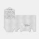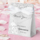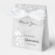 Elegant, klassisk, glamorös och giftig för en Quinceañera, 15:e födelsedagsfesten är till fördel. En faux silver tittar bakgrund med konetti och en klänning. Med texten: Quinceañera och Tack skrivet med ett modernt handskript i stil. Anpassa och lägg till ett namn och ett datum.