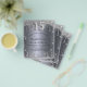 En modern, stilfull och glamourös inbjudan till en flickas Quinceañera, 15-års födelsedagsfest. En falsk silverfärgad bakgrund, dekorerad med glitterdamm. Anpassa och lägg till ditt namn och festdetaljer. Nummer 15 är skrivet med en ballongstilad teckensnitt, handskrift.