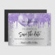 En faux silver tittar bakgrund som dekorerats med violett, lavender färgad faux glitter och ballonger. Anpassa och lägg till datum och namn/ålder. Texten: Spara datumet skrivs med ett stort trendig-handskript i stil.