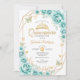 Turkos, guld och vit Quinceanera firande inbjudan. Funktioner, typsnitt för skript, guld-fjärilar, vattenfärgen grönt ro och tiara. Perfekt för en elegant prinsessan stil glam firande. Anpassa med dina egna detaljer. Skrivna Zazzle-inbjudningar eller digital utskrivbar mall för omedelbar nedladdning.