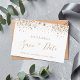 Ett giftigt och trendig Spara datumkortet för en Quinceañera, 15:e födelsedagsfesten. En snyggt vit bakgrund som dekoreras med faux guld glitter damm. Anpassa och lägg till datum och namn och text. Golden färgad brev. Texten: Spara datumet skrivs med ett stort trendig-handskript i stil.