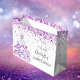 En presentpåse för en girig och glamorös Quinceañera, 15:e födelsedag. En snyggt vit bakgrund som dekoreras med damm från lila Faux glitter. Anpassa och lägg till ett datum och namn. Namn är skrivet med ett modernt handskript i stil