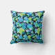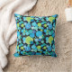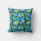 En snyggt Cushion eller Dekorativ kudde, med ett krångligt "Blue Måne mönster i ljusblå blues och neon grönt på svart bakgrund, från en handmålad papper kollagedesign av Judy Adamson. En del av Posh & Painterly 'Blue Måne range.