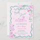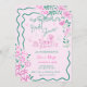 En modern vismisk och funky hand plockade klottar inbjudningskort för möhippan efter den senaste trenden i bröllop stillastående. En bläckfisk vågigt gräns ram och illustrationer av vilda blommor gör det till en perfekt contemporary trendig inbjudan. Rosa och grönt färg och ett modernt båge.