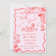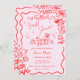 En modern vismisk och funky hand plockade klottar inbjudningskort för möhippan efter den senaste trenden i bröllop stillastående. En bläckfisk vågigt gräns ram och illustrationer av vilda blommor gör det till en perfekt contemporary trendig inbjudan. Fet röd och rosa färg inbjudan.