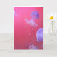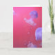 Konstfotografi av lila maneter flytande i ljusstrålande rosa vatten.
