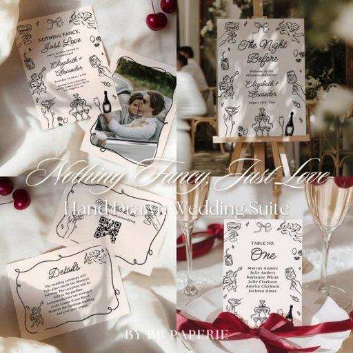Den här lekande och romantiska bröllop-stationsuppsättningen ger en lätt charm till din stora dag. Temat "Ingenting Finare, Just Kärlek - Quirky & Whimsical" innehåller handritade illustrationer av lysande glasögon, dans figurer och champagne - allt i en roligt, sketch-stil-konst. Med sin avslappnad elegans och en liten aning humor, fångar denna pappra bra parens vibb som vill ha något bakslag, fullt av personlighet och totalt dem. Perfekt för det moderna firande som handlar mer om kärlek än om tradition.