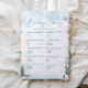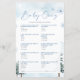 Baby Quiz-spel. Baby Shower på vintertema med gräs träd och snöflingor. Här är svaret på frågeformuläret för babyskor nyckel 1.b, 2.c, 3.b, 4.b, 5.a, 6.a, 7.b, 8.a, 9.a, 10.b.