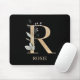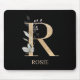 Brev R monogram blommigt. Brev R i guldbrun struktur accentuerad med grönt vattenfärgade löv, blommor och blommar från guld. Personlig med namn i matchande teckensnitt.