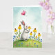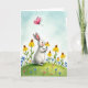 Designed with a soft watercolor look, this card shows a white bunny 🐰 with rounded features and pink-lined ears sitting on a gently rolling green hill. A faint blush on its cheeks and the way it leans into a yellow coneflower at its nose gives the scene a sweet, almost affectionate mood. Around the bunny, tall yellow coneflowers with brown centers rise like friendly companions, while tiny blue and pink blossoms sprinkle the grass like confetti. Near the top portion, a short Easter greeting appears in a light, easy-to-read font, set in a warm pastel tone that stands out against the pale sky. The background stays airy with a light blue wash, keeping the focus on the bunny and flowers 🌷. A small butterfly with deep red wings floats above, adding a gentle sense of motion. The hill fades softly at the lower edge, with scattered petals and specks of color tucked into the grass. Share Easter sentiments with someone you care about.