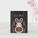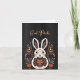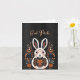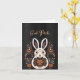 Skandinavisk vit, orange och blå kanin på en svart bakgrund som önskar någon Gud Påske.