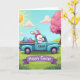 Designed with a spring scene in mind, this card features an upright white rabbit with long ears and a small red bow, smiling as it drives an old-fashioned aqua pickup truck 🐰. The rabbit’s bright eyes and gentle grin suggest it’s on a sweet delivery for someone special, like a friend it can’t wait to see. On the truck door, a short hand-lettered note in dark ink sits neatly along the side, hinting at a seasonal delivery without stealing focus. In the wooden truck bed rest two oversized decorative eggs, one calm blue with wavy lines and one purple with tidy horizontal stripes, arranged like a thoughtful gift. Above, an azure sky holds soft pink-tinted clouds while a golden sun glows from the upper left, warming the scene. A wide green lawn spreads across the bottom, and a purple banner near the lower edge carries a seasonal greeting in light-colored letters, with a small 🌷 nearby. To the right, a sturdy tree is covered in bright pink blossoms, its clustered flowers framing the truck as it rolls by.