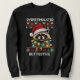 Funny Christmas design: A raccoon slightly overwhelmed by Christmas, wearing a Santa hat and string of lights. Along with the saying "OVERSTIMULATED BUT FESTIVE."